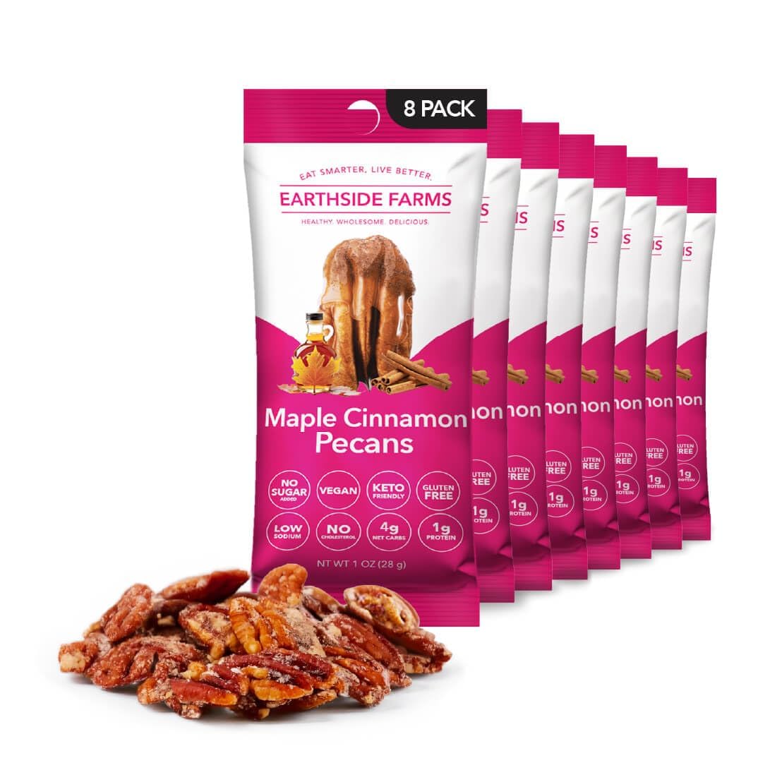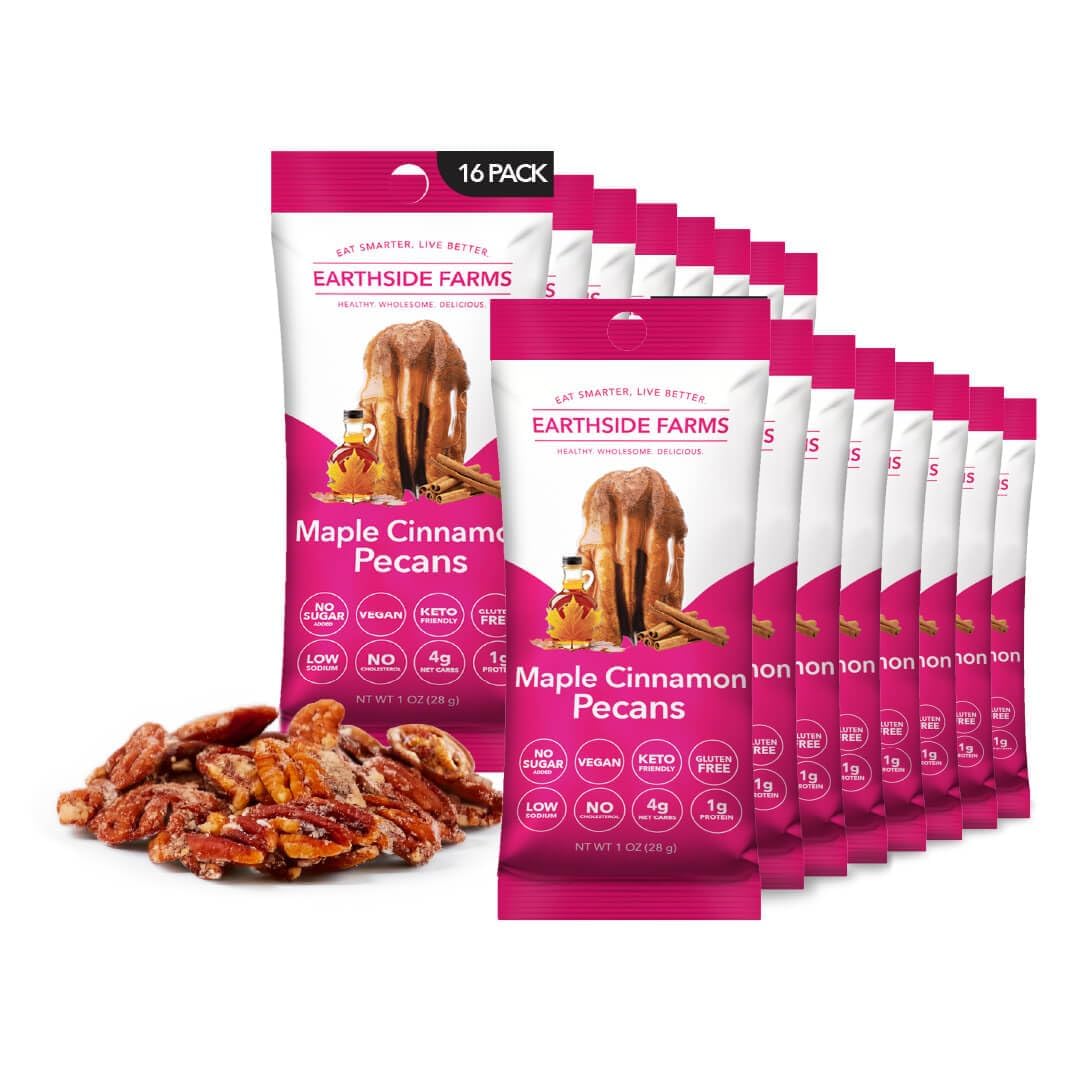 Earthside Farms' keto-friendly, gluten-free, non-GMO Maple Cinnamon Pecans are here to offer the rich, praline flavor you love, without the sugar overload.